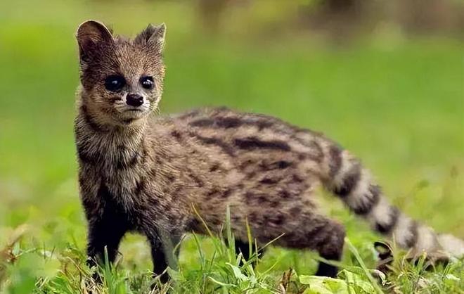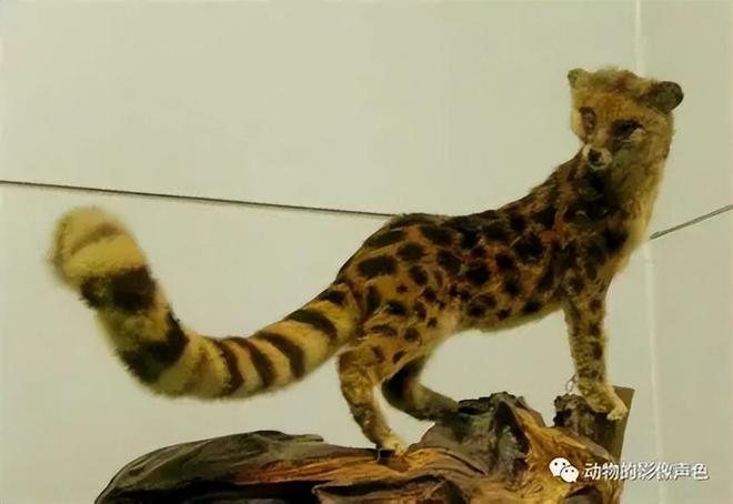 据了解,斑林狸体背和体侧分布着多列较大的黑色圆形或卵圆形斑点,而前肢和胸腹外侧的斑点则较小,呈点状分布。尾巴上密布着8-10个清晰的黑色环纹。