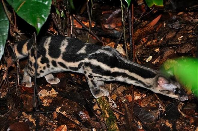 斑林狸是国家二级重点保护野生动物,属于食肉目灵猫科林狸属。这种体型纤细修长的动物,头体长31-45厘米,尾长30-40厘米,体重0.6-1.2千克,其尾长几乎与头体长相当,尾尖呈现白色。